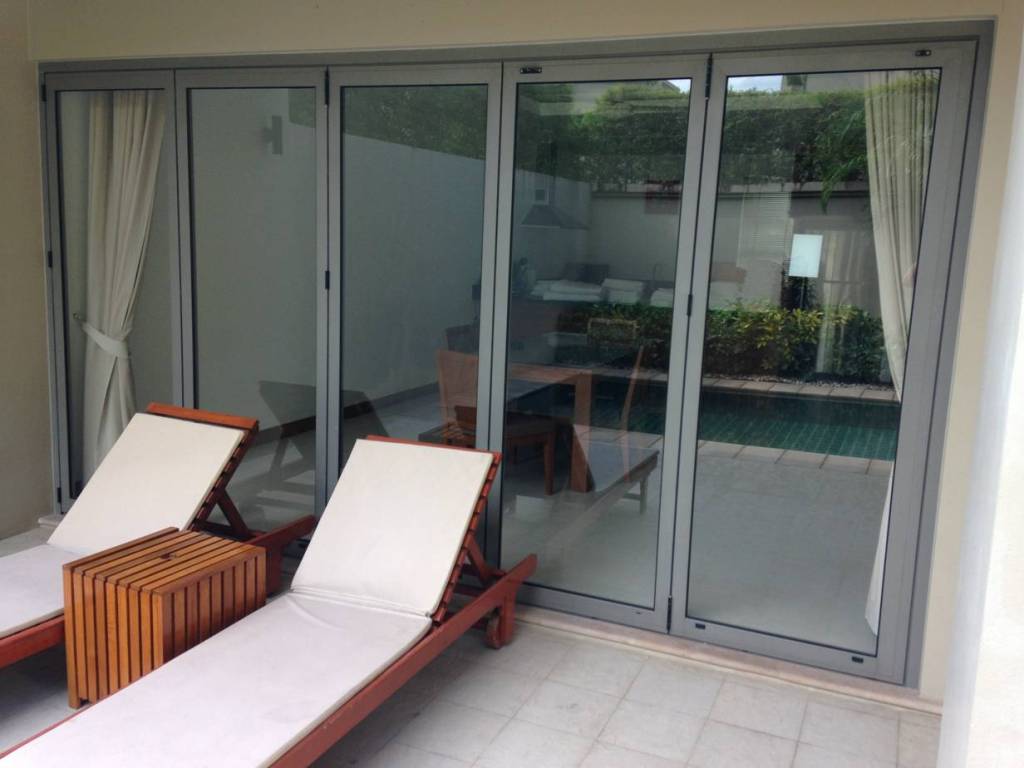 The full height glass doors of the living room and master bedroom open fully to provide a unique melding of the inside area of the villa with the sun terrace, tropical garden and swimming pool.