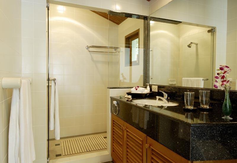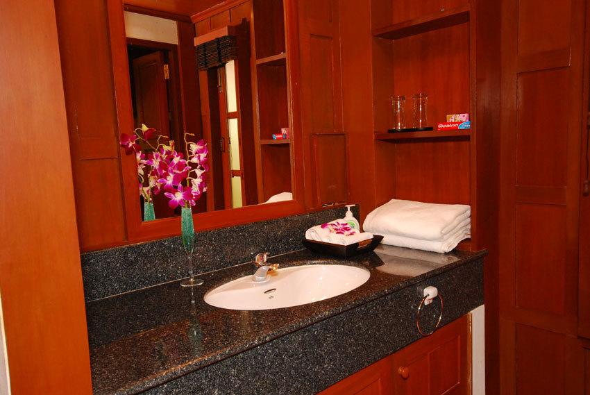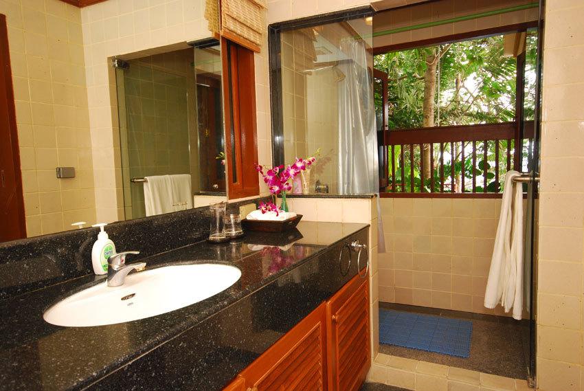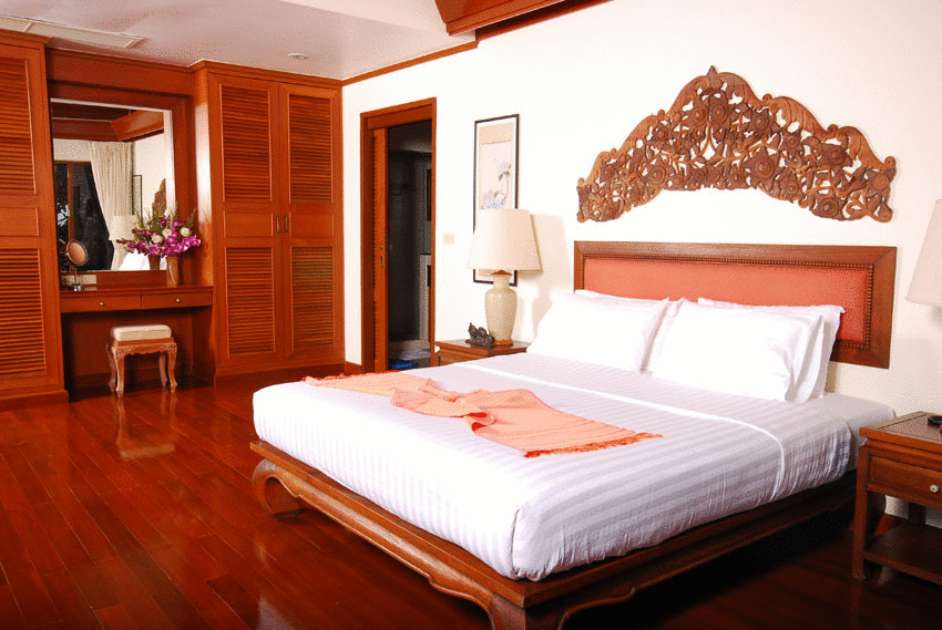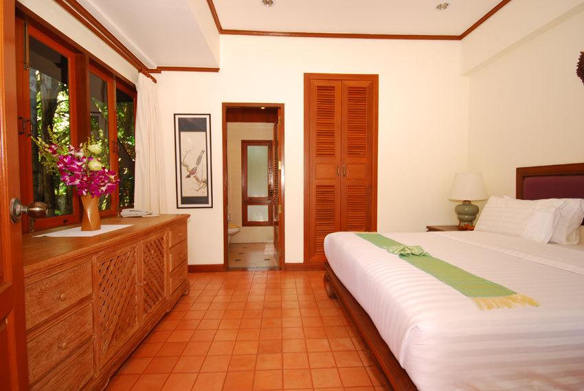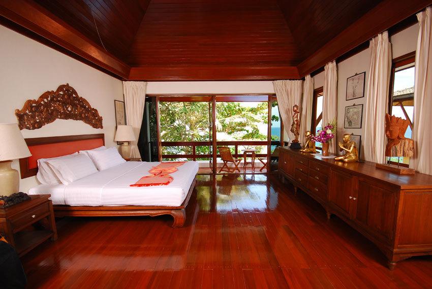 • Main bedroom features Thai style wooden floor and vaulted ceiling, private balcony overlooking swimming pool