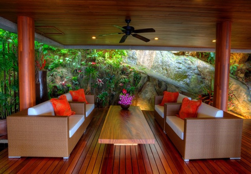 Enchanting bronze patina Kinaree statues adorn the terrace reflecting the villa’s character; these angelic figures of Thai mythology are celebrated for their grace, beauty and artistic skill. A sense of grace and harmony flows through the villa, with its stately pitched roofs, extensive use of natural stone and wood, lily pond feature, clean lines and charming art accents including African wildlife paintings and colourful lamps shaped like bejewelled Fabergé eggs.