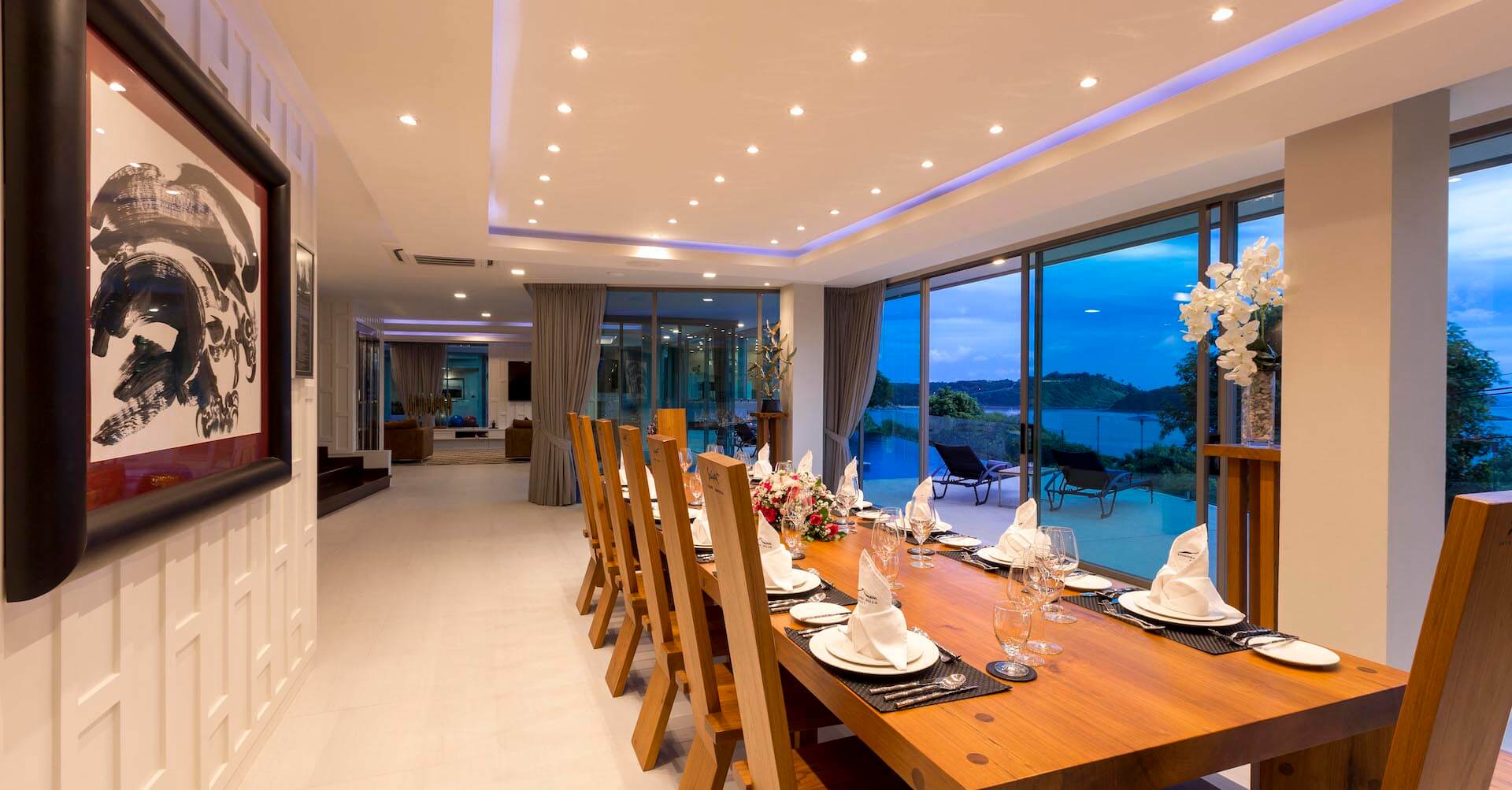 The large kitchen and dining come with a table for 18 and a sea view for all.