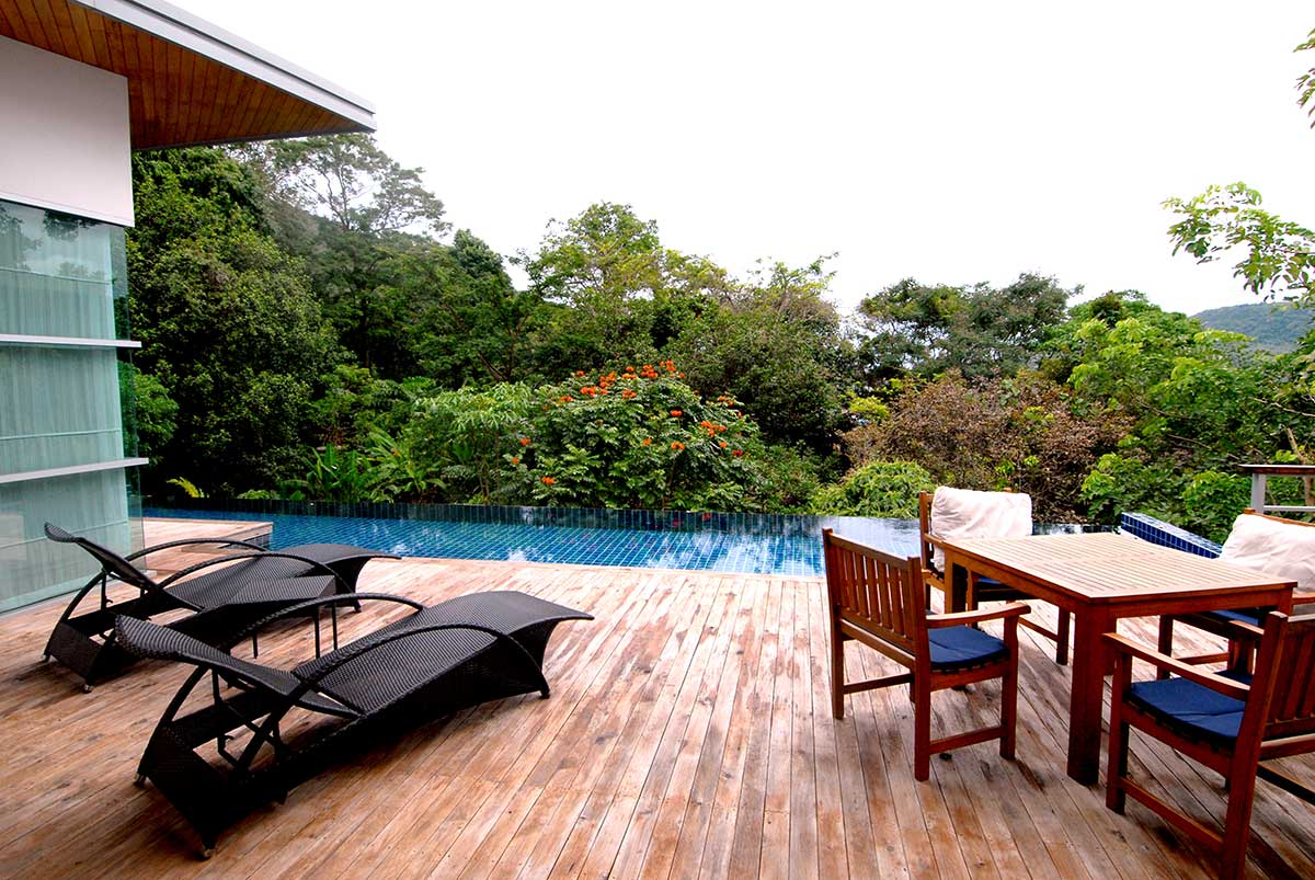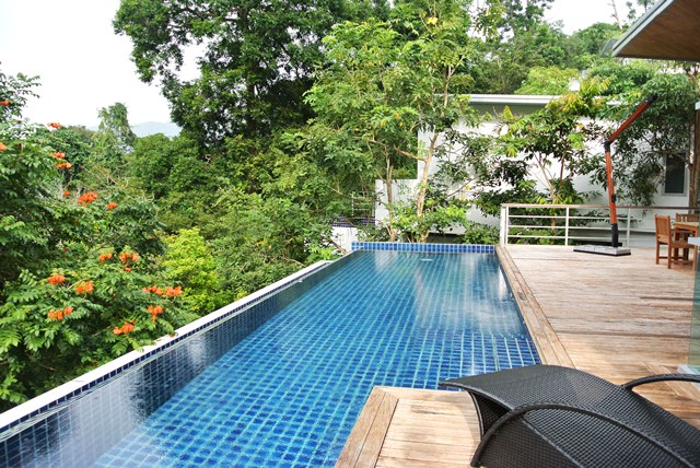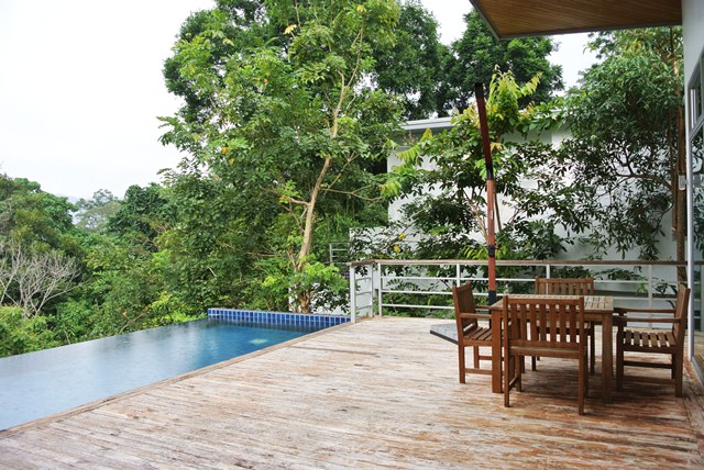 The kitchen is modern with all the necessary appliances , from the pool decking are views of green shrubbery and a small part of the ocean in the distance