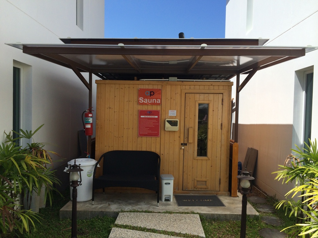 The communal area has a large free-form swimming pool as well as a gym and sauna.