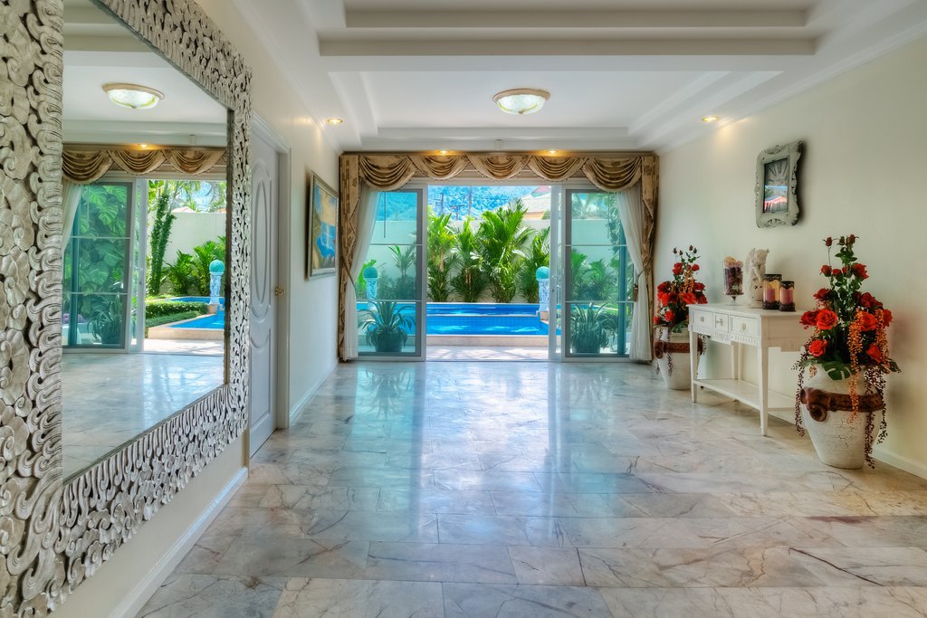 A spacious living area decorated very nicely with lots of flowers and decor items, from the livingroom you can access to a terrace and a private swimming pool.