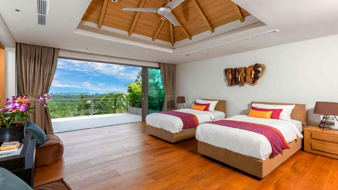 Bedroom 4 has a king size bed, seating area, flat screen TV, wardrobes, en suite bathroom and doors opening onto the large balcony with dining table for two and sun beds. Bedroom 5 is identical except for having two single beds. Both have unobstructed sea and jungle views.