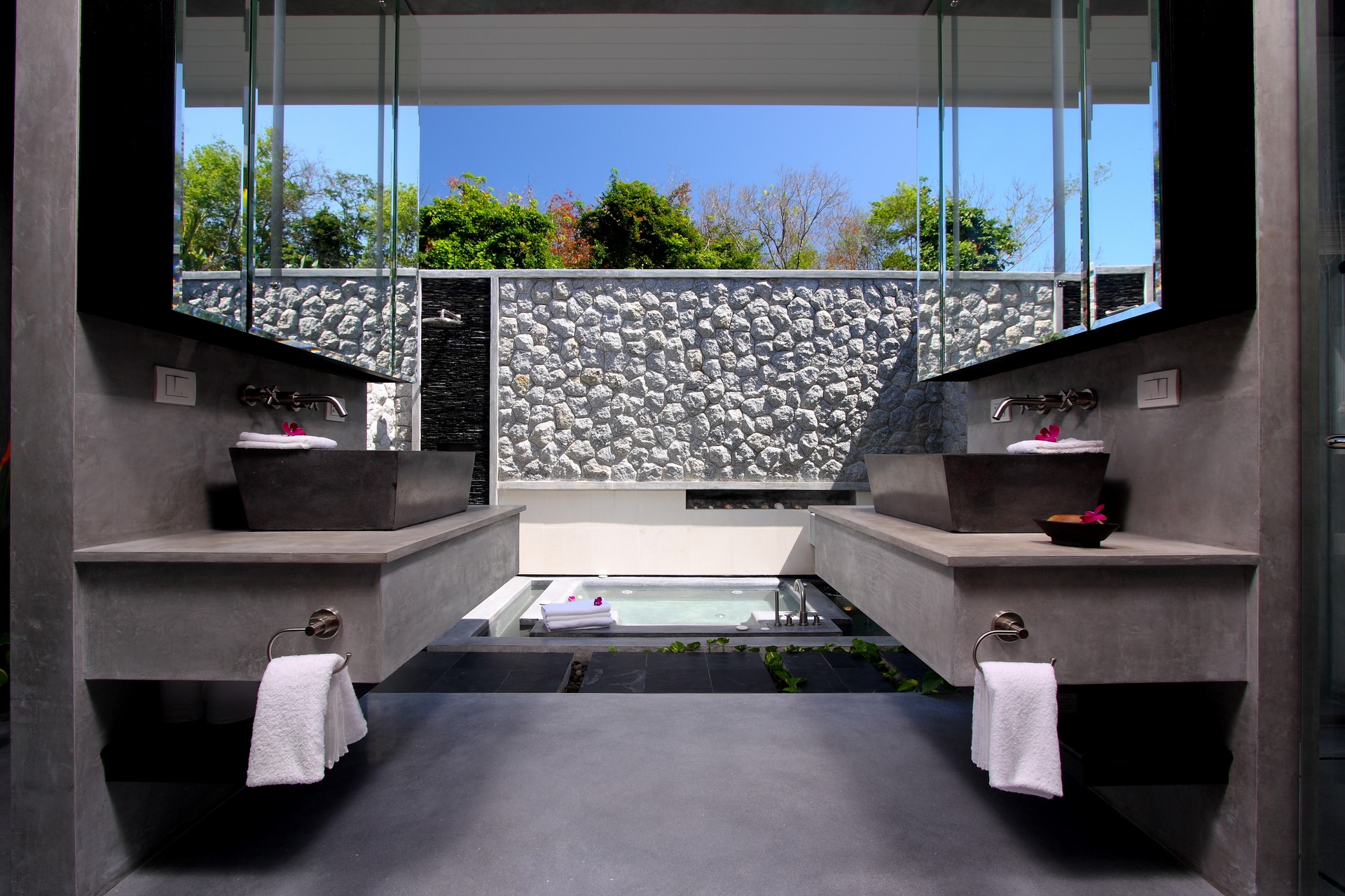 The bathroom en suite has an indoor shower + an outdoor shower and Jacuzzi with lovely views.