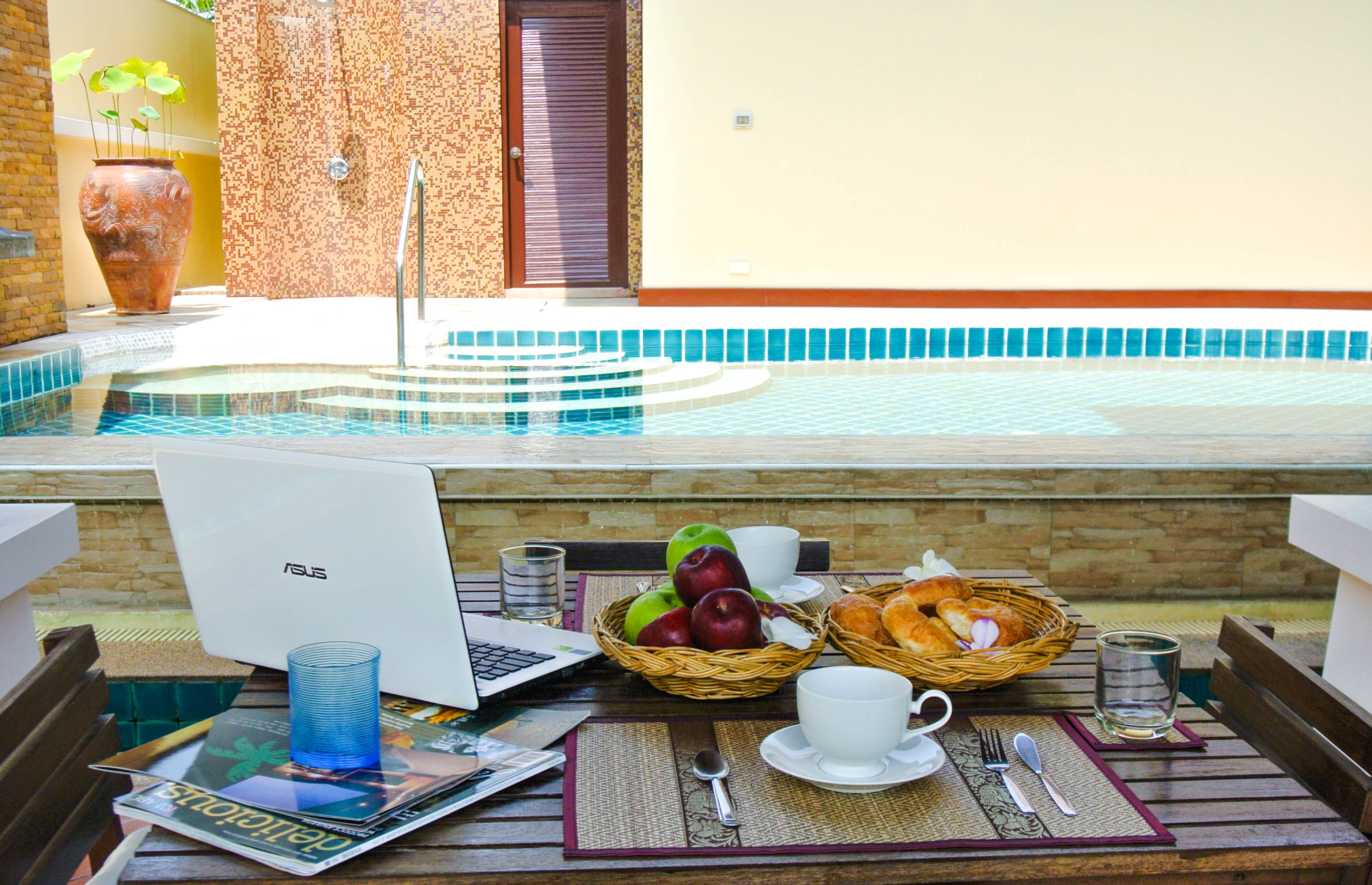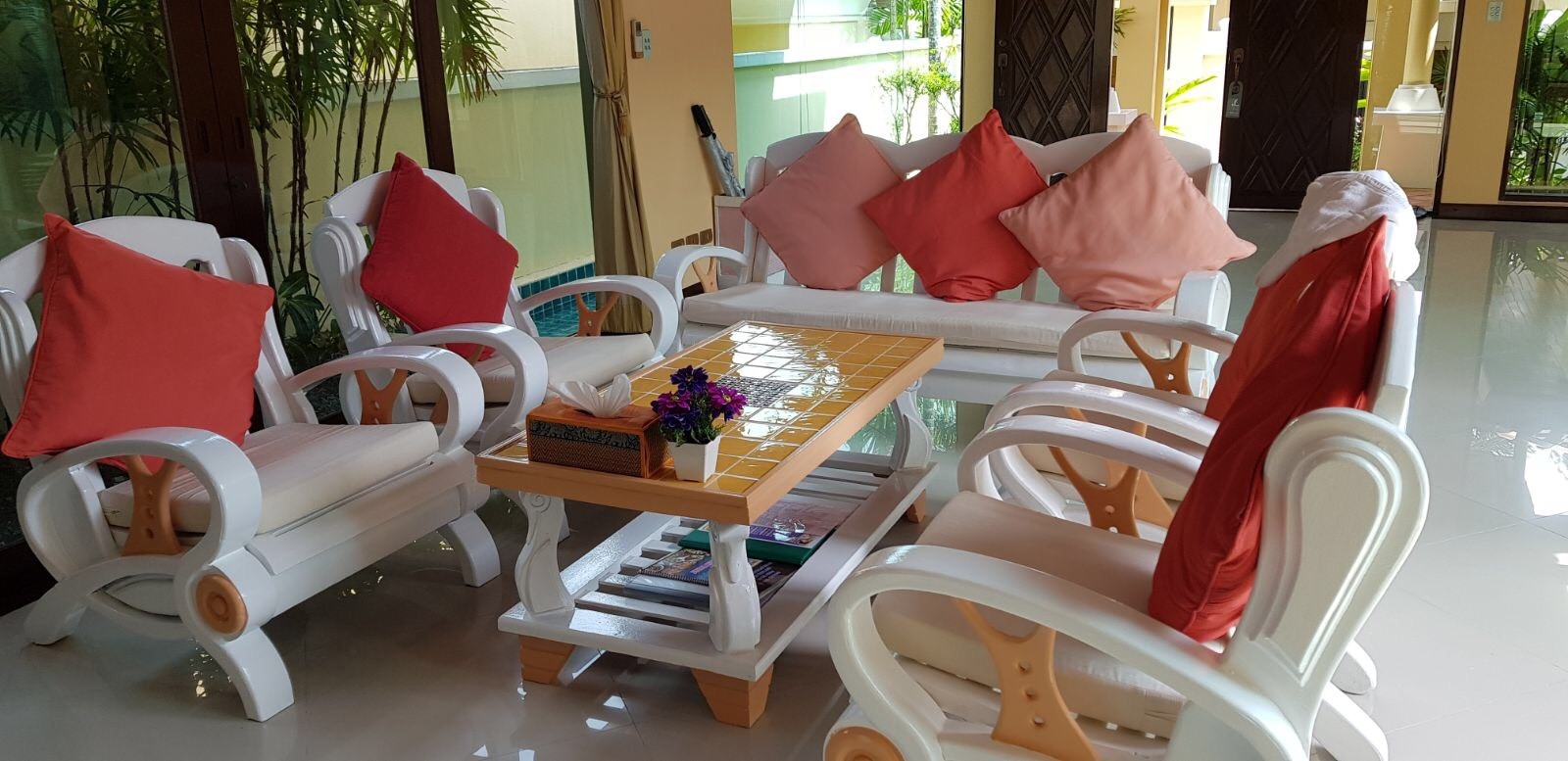 With tall ceilings, ducted air-conditioning and picturesque wooden vaulted ceilings, the environment oozes elegance. The teak furniture against the gleaming white ceramic floors creates a classy feel. From every part of the lounge, you can look out towards the swimming pool through the surrounding tall windows.