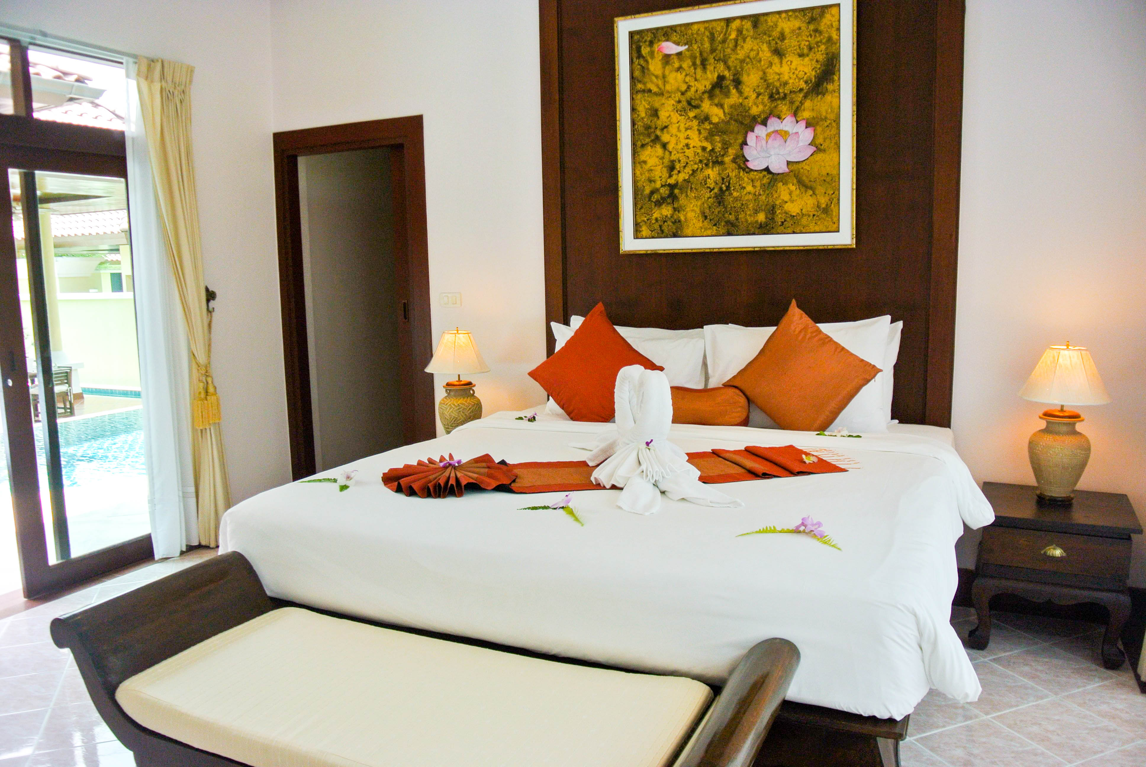 The two bedrooms have king size beds, air-conditioning and ceiling fans and en suite bathrooms, and are beautifully decorated with the same Modern Asian theme that runs throughout the entirety of the villa.