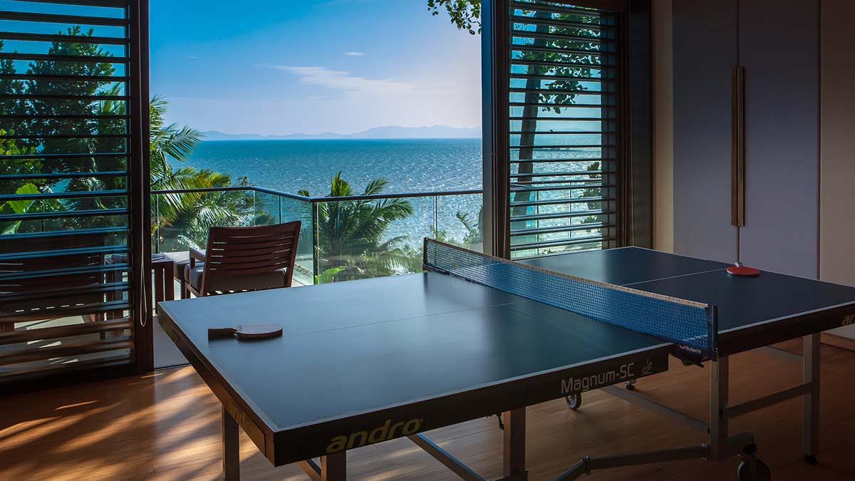 Satellite TVs; DVD players; iPod and iPod dock; outdoor Bose speakers; table tennis.