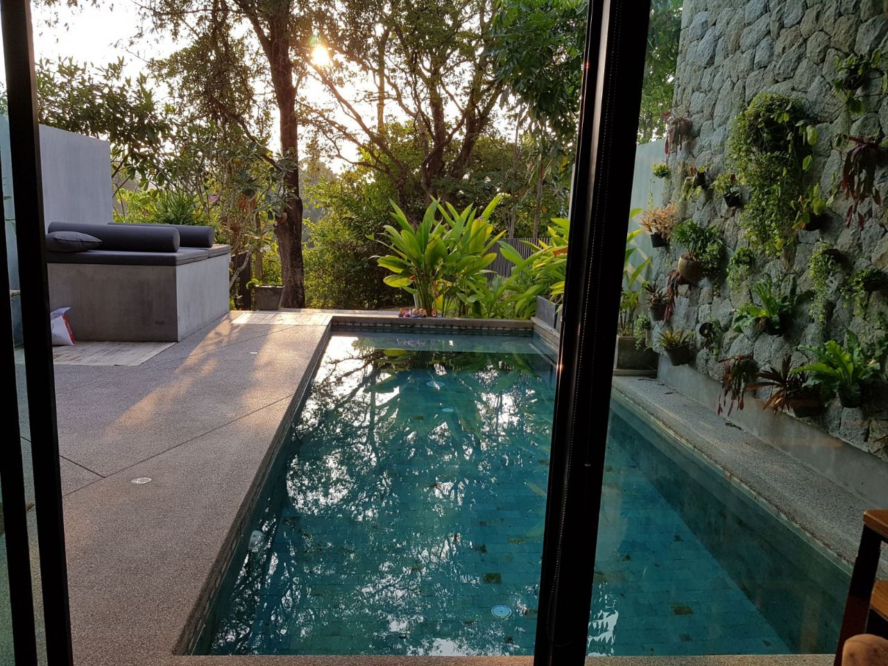 Also use of unique lava stone tiles which create a deep emerald green coloring for the pool.