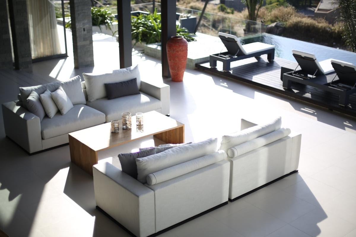 The villa’s majestic entrance pavilion is a wonderful place to linger and relax, with its high vaulted roof that offers shade for the comfy sofas set in front of a burbling pool.