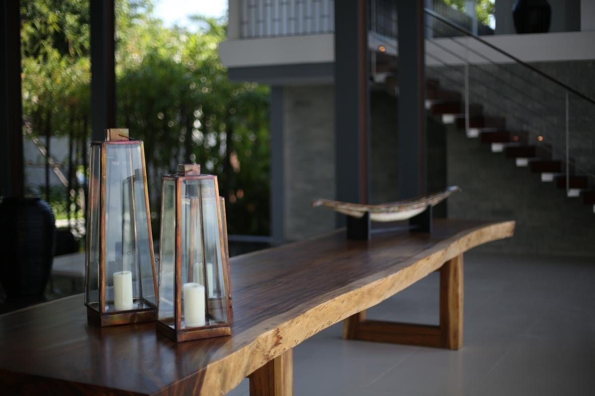 The gym on the villa’s lower floor overlooks the garden, carefully landscaped with colorful tropical trees and plants.