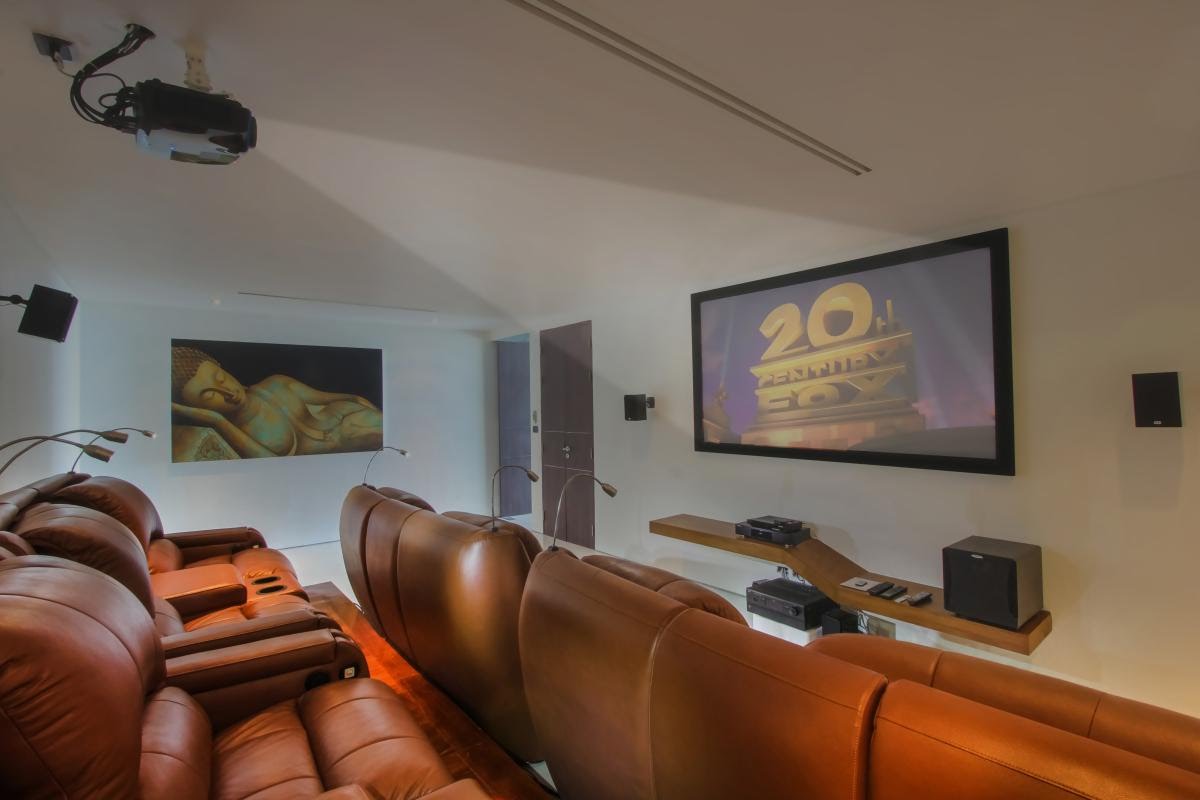 To the other side of the entrance is a games room with pool table, bar and entertainment unit adjacent to the sumptuous home cinema, fitted with projector screen and soft seats designed for an authentic cinematic experience.