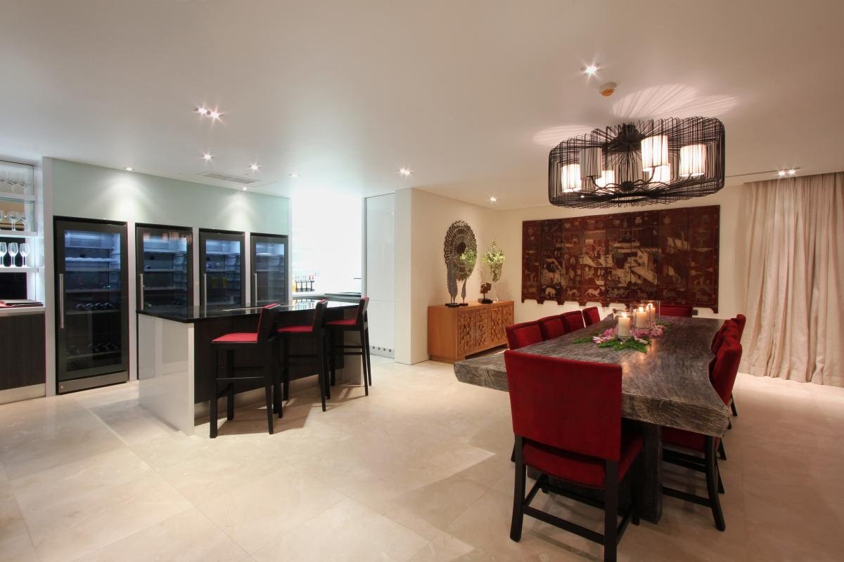 A notable exception to this vibrant marine theme is the dining area, with its chic bar and guest kitchen, sumptuous red suede chairs and 12-seater solid wood table, Asian artifacts and black chandelier evoking a sense of the exotic.