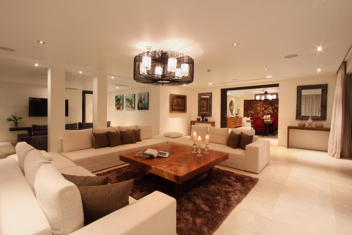 To one side of the entrance is the living room, a cool escape with an inviting white sofa lounging area oriented to view the sunset through floor-to-ceiling glass walls.