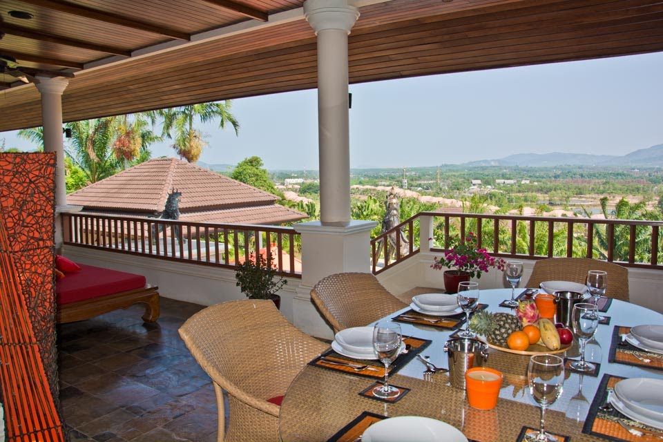 The large balcony with outdoor furniture overlooks the pool and the well-established gardens.