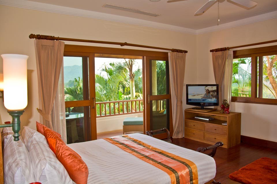 A large private balcony with outdoor furniture overlooking the valley completes this bedroom.