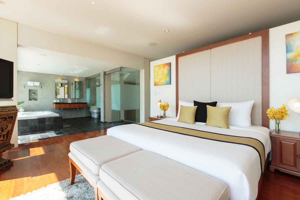Villa’s main hub is its open-plan living room, an airy, sun-drenched space with high vaulted ceilings and glass walls that showcase spectacular views. Adjacent, an amply sized kitchen and dining area allow the whole family to eat together, and come complete with a personal live-in chef who can prepare authentic Thai, Indian and Western food to order.