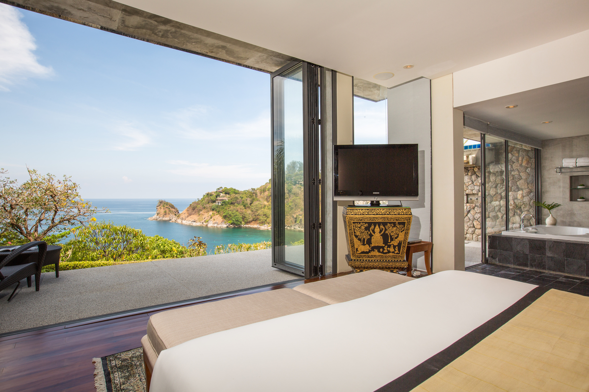 Modern European design meets majestic island views at the six-bedroom, six-bathroom Villa. Stone Buddhas mix with Oriental rugs for a subtle Asian aesthetic, while the villa’s brushed concrete and stone detailing blend naturally with the raw beauty of Phuket’s coastline.