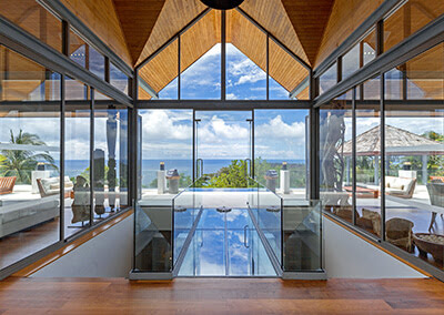 The villa’s entrance leads to a modern, glass-floored hall that boasts panoramic views of the Andaman Sea.