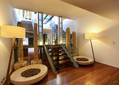 Steps lead up to the master bedroom suite at the villa’s highest point.