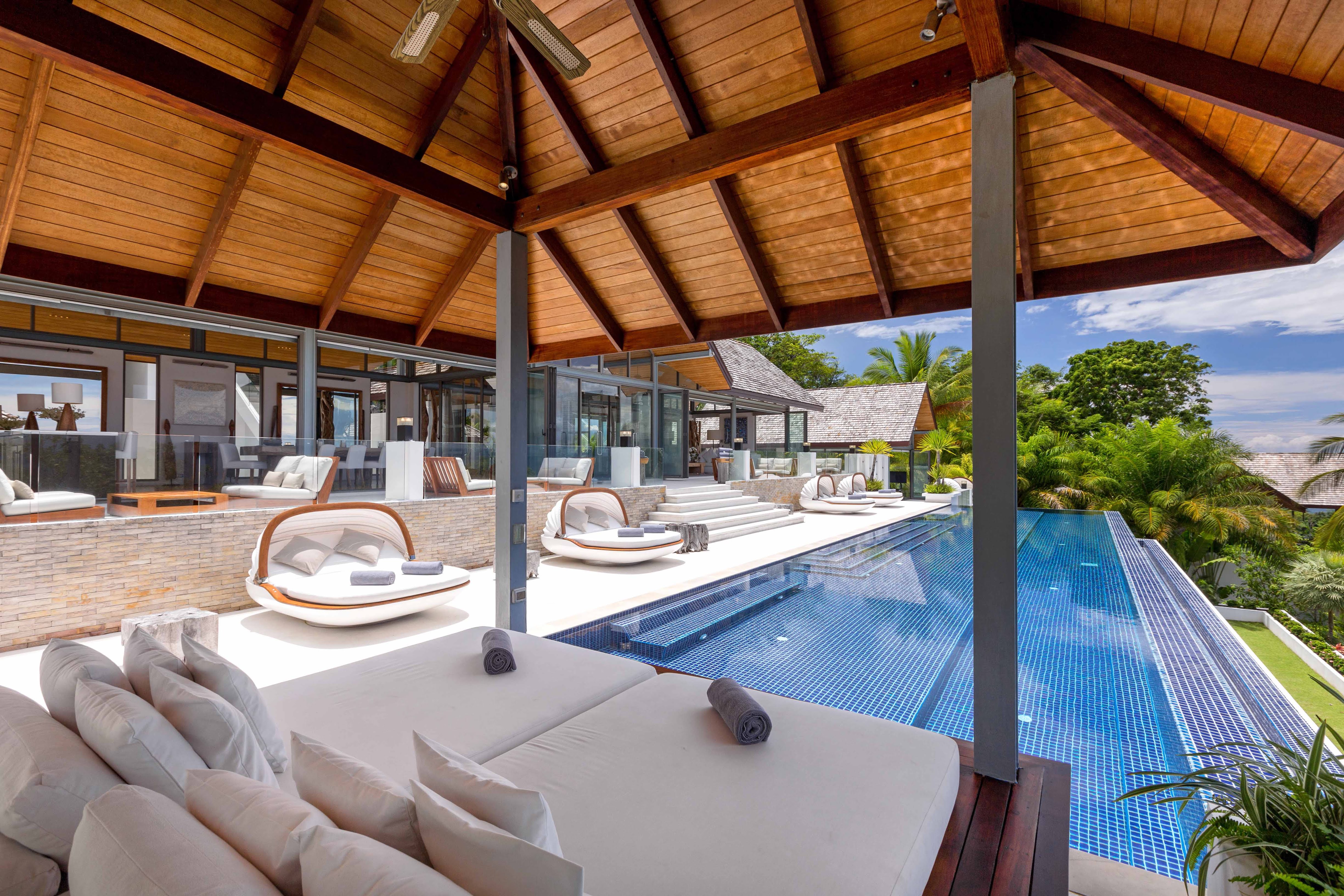 A large, split-level poolside terrace and 22 x 5m infinity swimming pool impressively span the entire length of the villa, and are complemented by plenty of chairs, sun loungers and a sala for shaded repose.