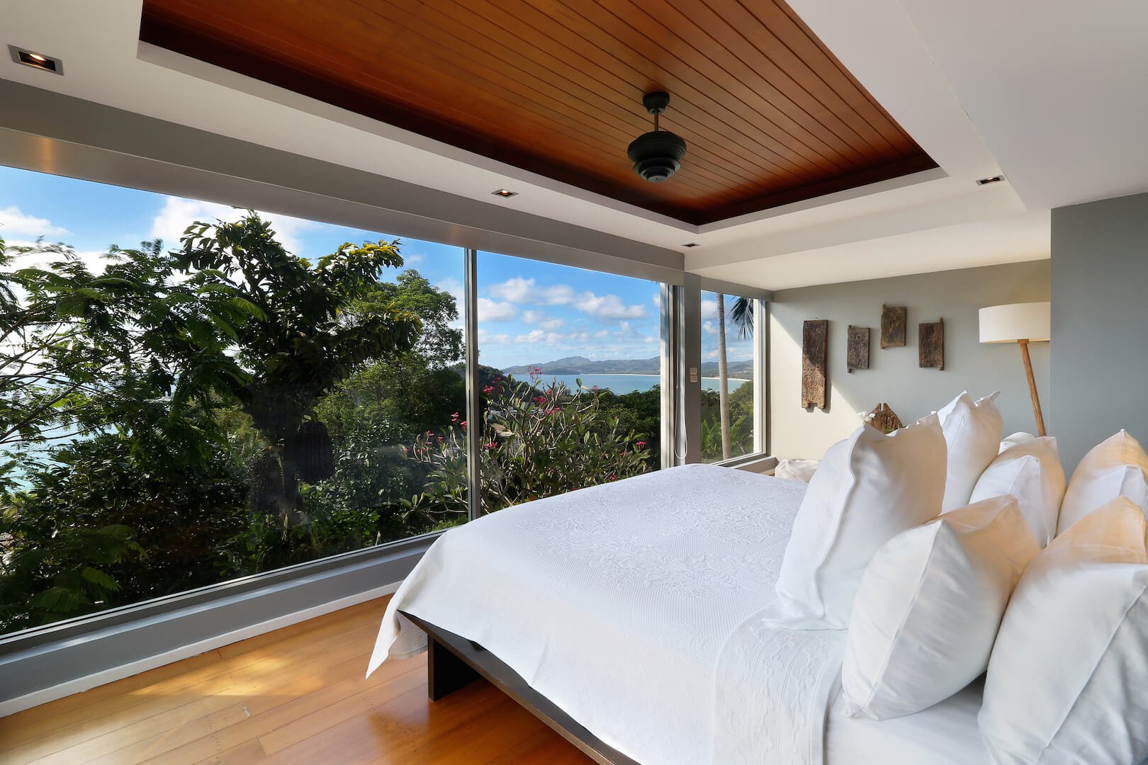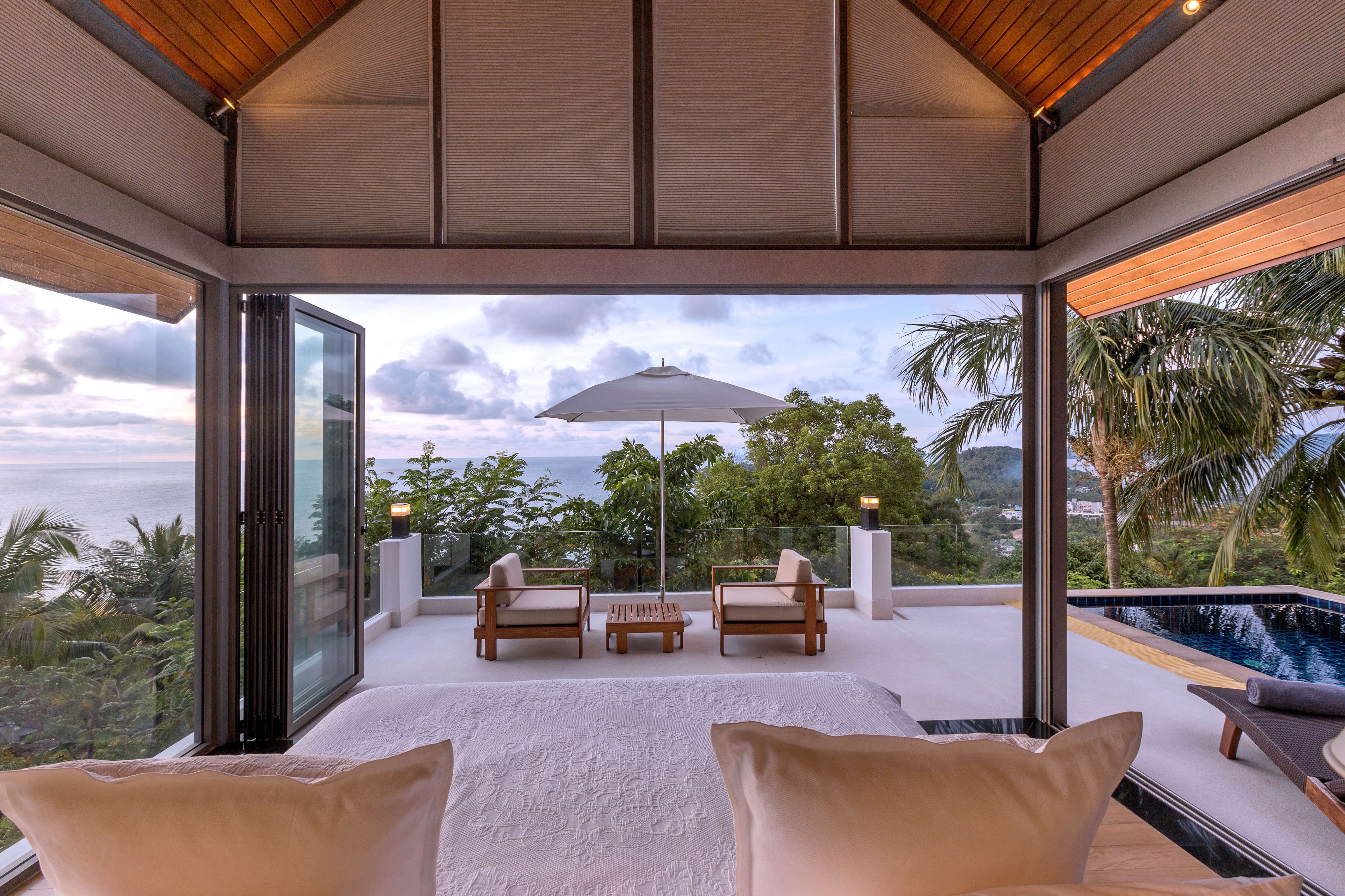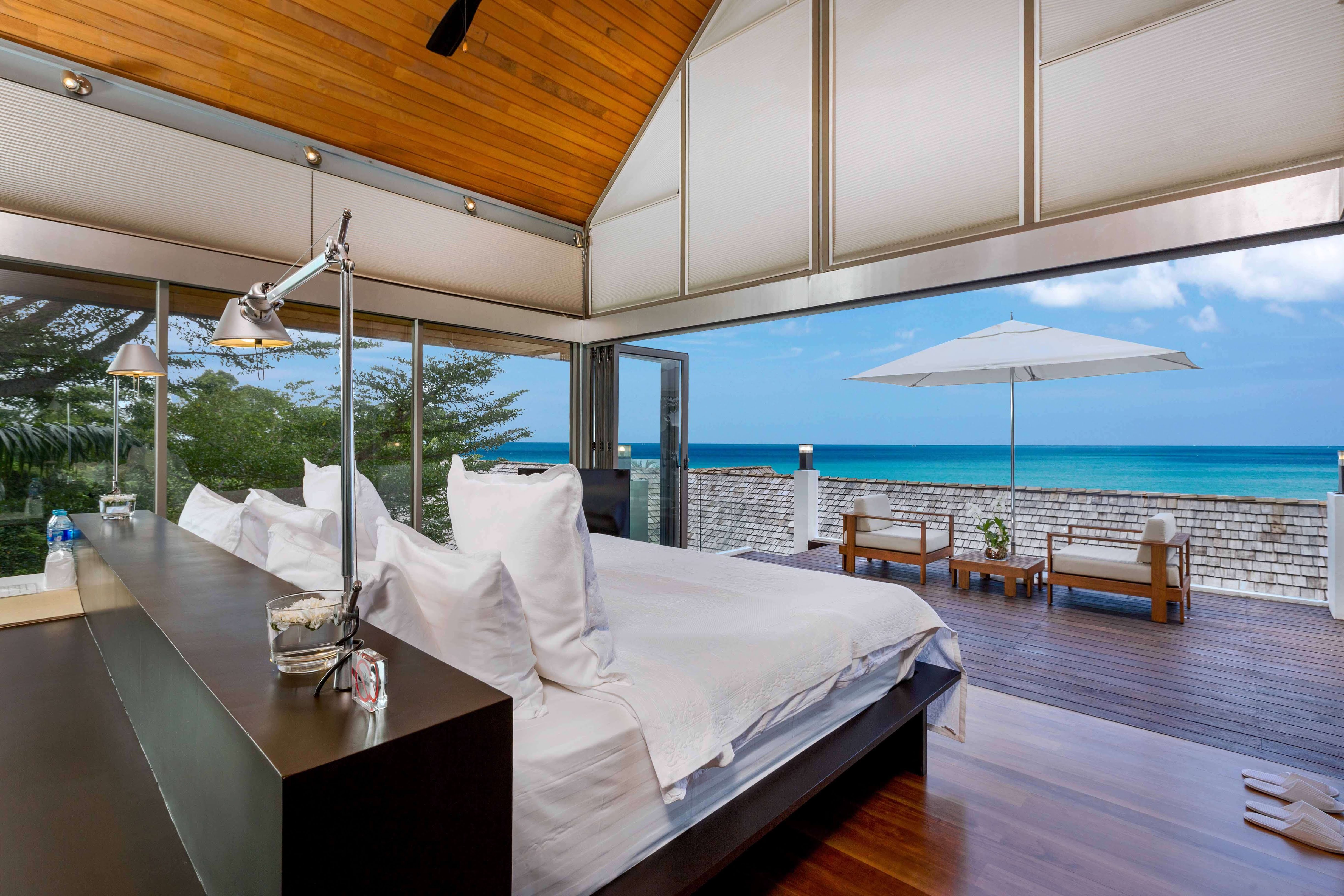 Encased on three sides by floor-to-ceiling windows, the room boasts panoramic views of Surin and Bang Tao Bays, a super king-sized bed, en suite bathroom with Jacuzzi, as well as a double vanity and a shower.