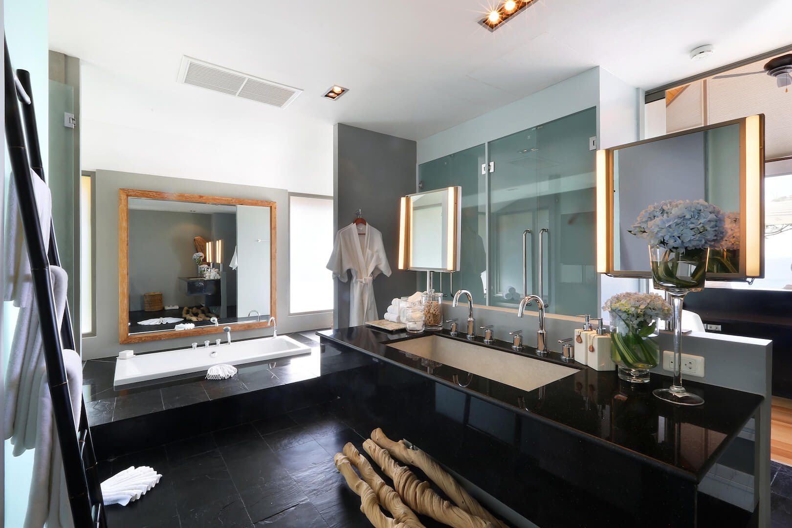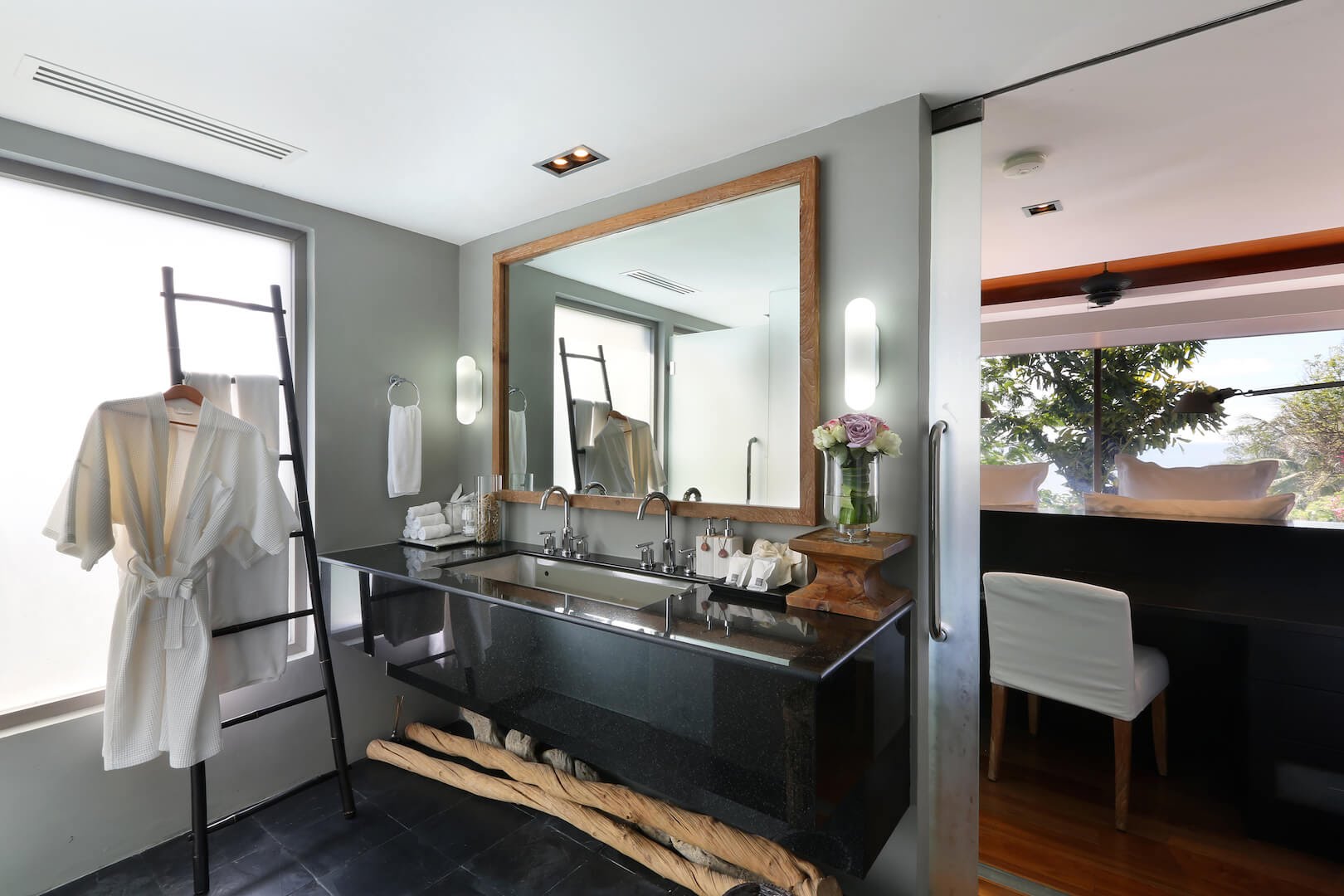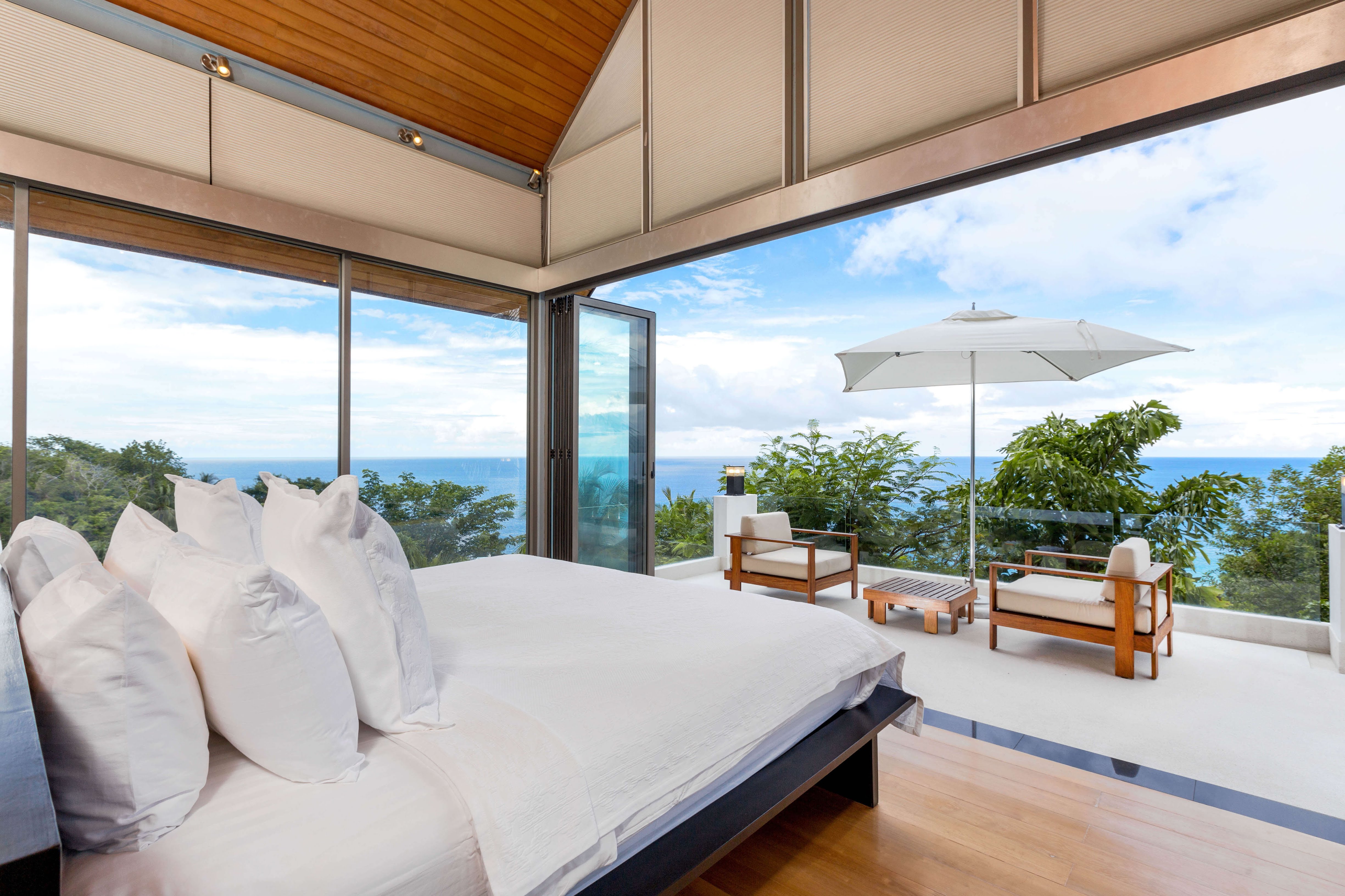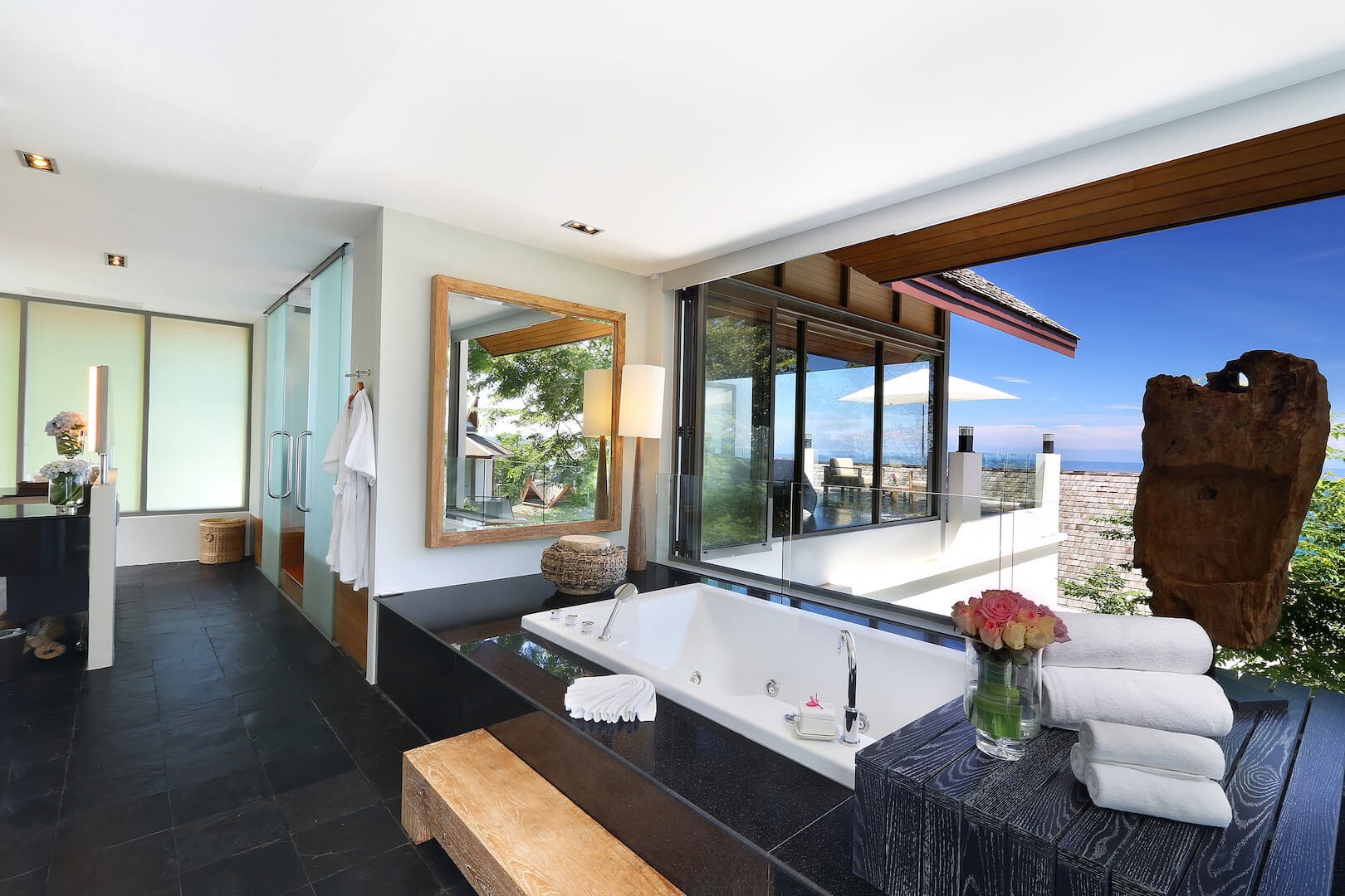 Encased on three sides by floor-to-ceiling windows, the room boasts panoramic views of Surin and Bang Tao Bays, a super king-sized bed, en suite bathroom with Jacuzzi, as well as a double vanity and a shower.