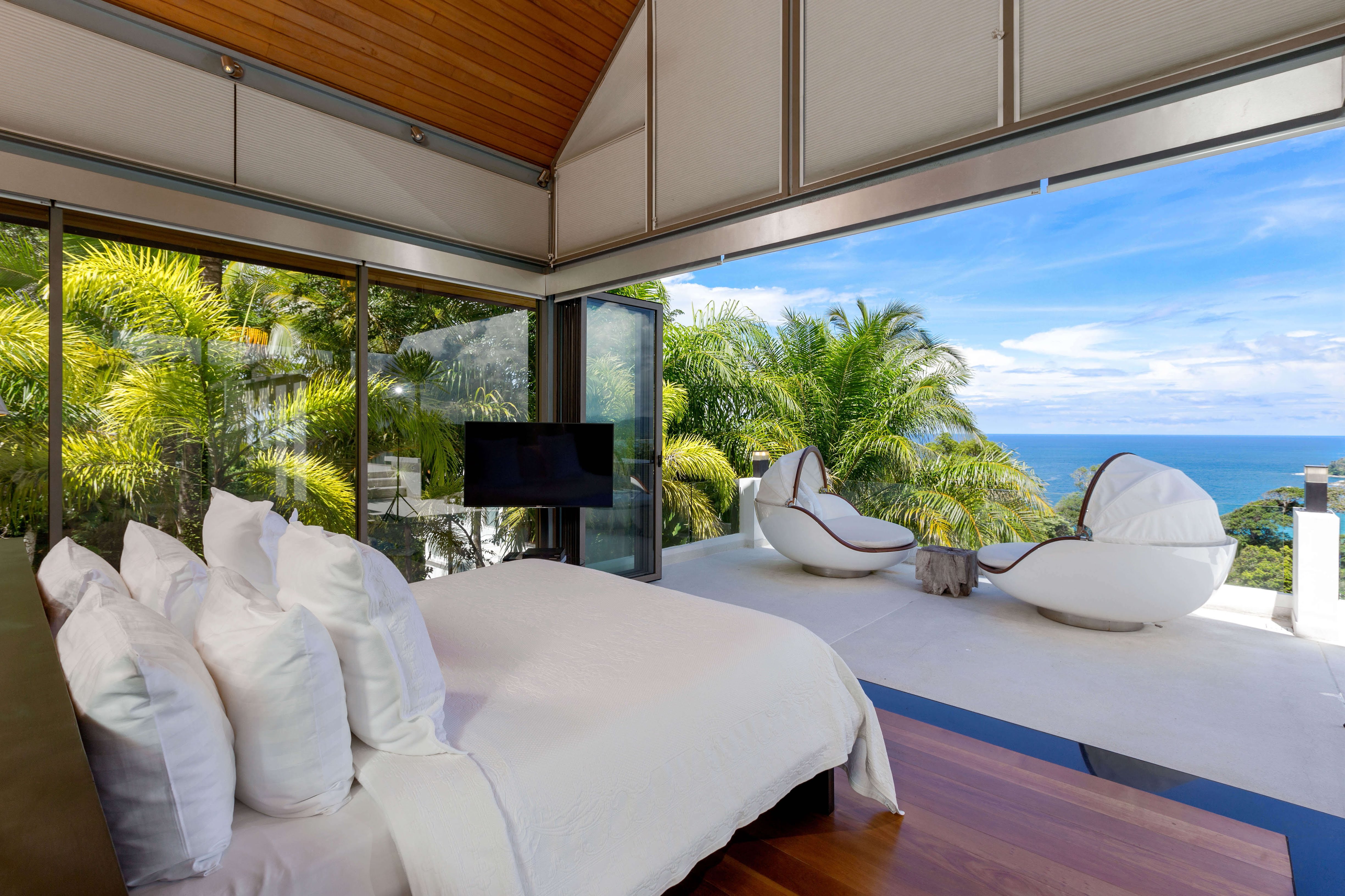 This bedroom lies a few steps down from the poolside terrace and is surrounded on three sides by floor-to-ceiling windows.